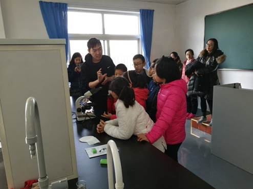 为了能让每个同学都参与到活动中,活动中张峰老师把同学们分成两大组, 每一大组又分成四小组,每小组4-5个人,其中一组同学进行化学小实验;另一组同学通过显微镜观察生物的细胞组织,两组同学完成各自任务后再互换位置。