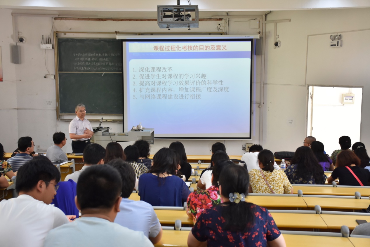 李金成副院长就申报的一流专业、国创情况做了说明。重点就学院下学期实行的课程过程化考核管理制度从目的与意义、实施步骤、平时成绩的组成内容参考建议、管理程序、配套制度、主要问题解决等方面做了讲解。