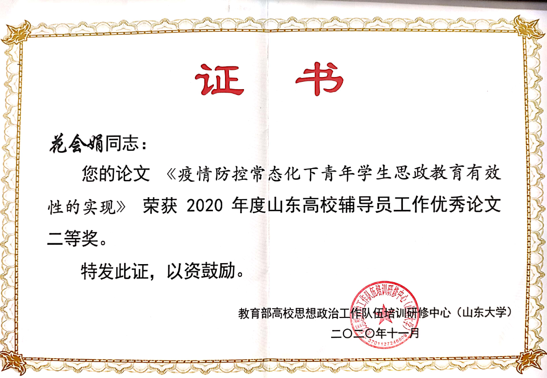近日,山东省高等学校学生教育与管理研究会2020年年会暨2020年山东高校辅导员工作论坛在潍坊举行。我院辅导员花会娟的《疫情防控常态化下青年学生思政教育有效性的实现》荣获2020年度山东高校辅导员工作优秀论文二等奖。