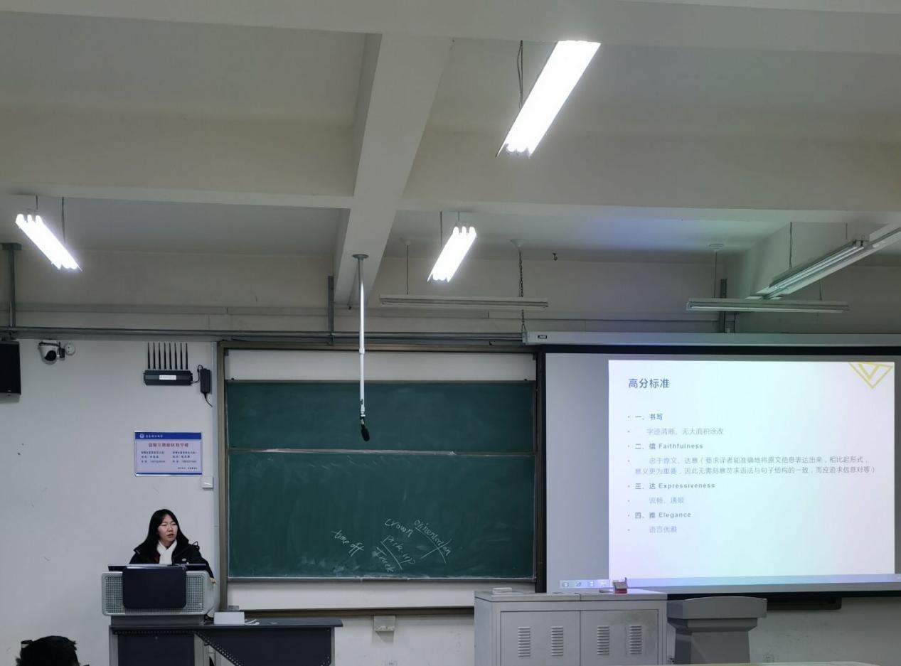 本次培训主要分为两部分,首先由李卓老师介绍大学英语四级的基本概况,并针对听力、阅读理解、完形填空三类题型给出相应的做题技巧及提高方法。其次由何珊珊老师针对翻译、写作两部分进行讲解,内容包含如何获得高分,做题步骤,以及相关做题套路。