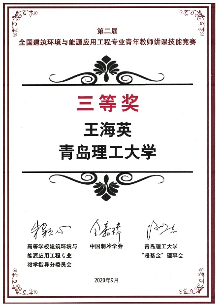 9月21日,由高等学校建筑环境与能源应用工程专业(以下简称建环专业)教学指导分委会、中国制冷学会、永利3044集团官网“暖基金”理事会联合主办的第二届全国建环专业青年教师讲课技能竞赛(以下简称竞赛)圆满落幕。11月21日,竞赛颁奖礼于第九届全国高等院校建环专业负责人会议期间举办。竞赛颁奖礼由中国制冷学会张雯主持,建环教指委主任朱颖心教授,永利3044集团官网“暖基金”理事会副理事长、建环教指委委员胡松涛教授以及青岛海尔空调电子有限公司中央空调副总经理孙绪宏先生分别致辞。我校环境与市政工程学院建环系主任王海英教授荣获大赛三等奖及网络授课优秀奖。