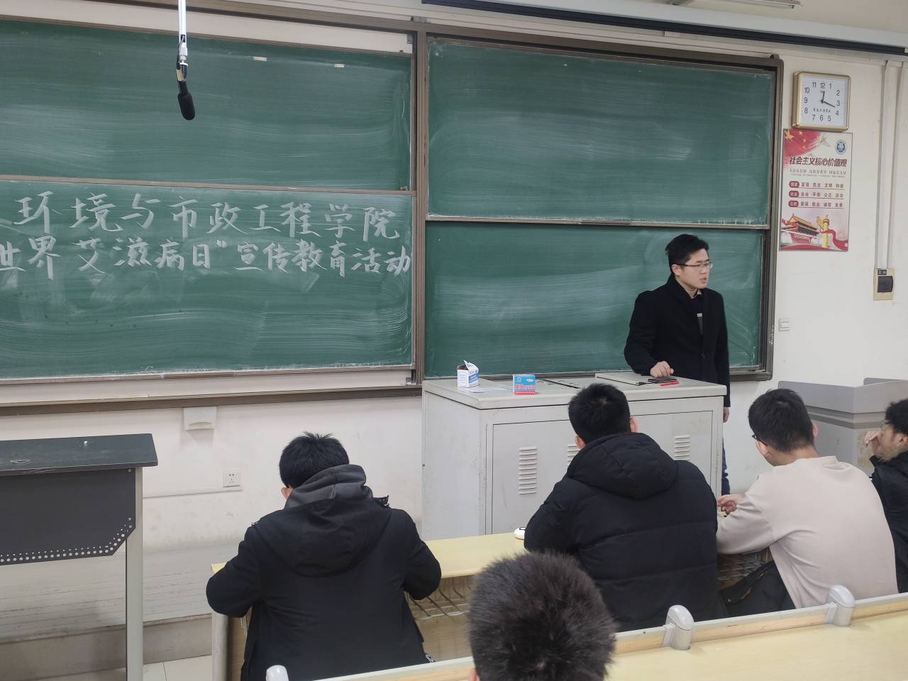为提高学生预防艾滋病的意识,12月1日,环境与市政工程学院在嘉陵江路校区主教学楼B208开展了第33个“世界艾滋病日”主题宣传教育活动,辅导员李卓、董业硕、何珊珊、宫克菲等参加会议,学院全体班长、团支书和宣传委员参加会议。