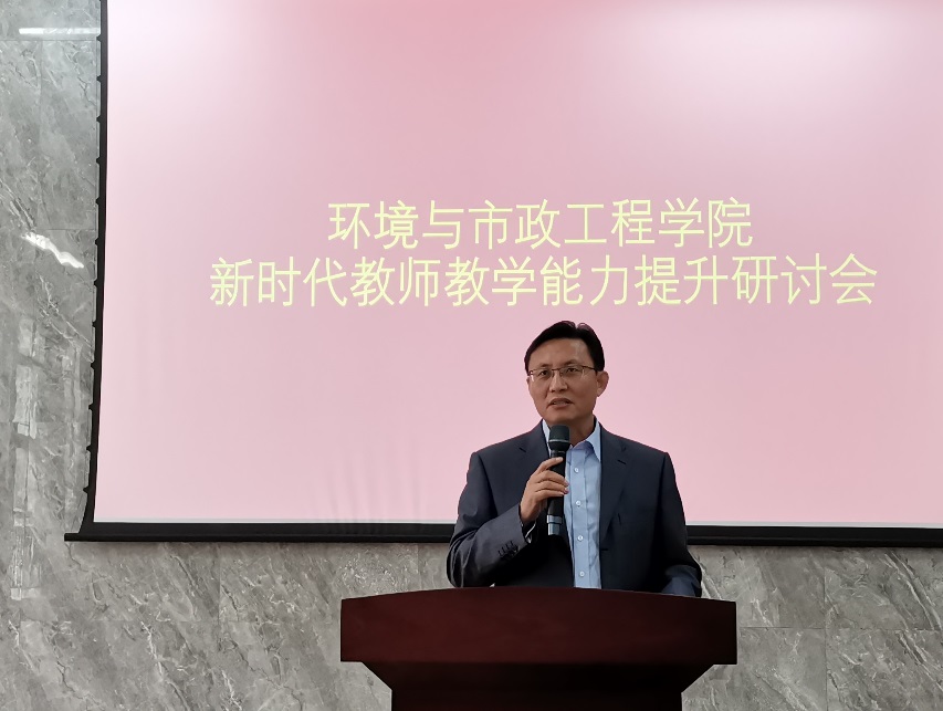 接着,环境与市政工程学院毕学军院长致辞。毕院长指出,作为新时代的大学教师,要不断因应经济社会发展需要,认真学习贯彻国家和省相关教育教学改革文件精神,着力培养德智体美劳全面发展的社会主义建设者和接班人;要紧紧围绕立德树人这一根本任务,聚焦人才培养这一主责主业,加强大学生的价值引领、知识传授和能力培养,上好每一堂课,做“四有”好老师。希望每位老师能够注重教学质量提高和产学研融合,扎根时代把学生培养成德才兼备的优秀人才。