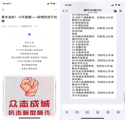 在假期期间,环境学院各年级各班严格落实晚点名制度,及时掌握同学们的动态,保证假期期间安全稳定。此外,学院通过公众号推送,线上会议等形式,向同学们进行疫情防控相关知识,切实做好节假日期间的疫情防控各项工作。