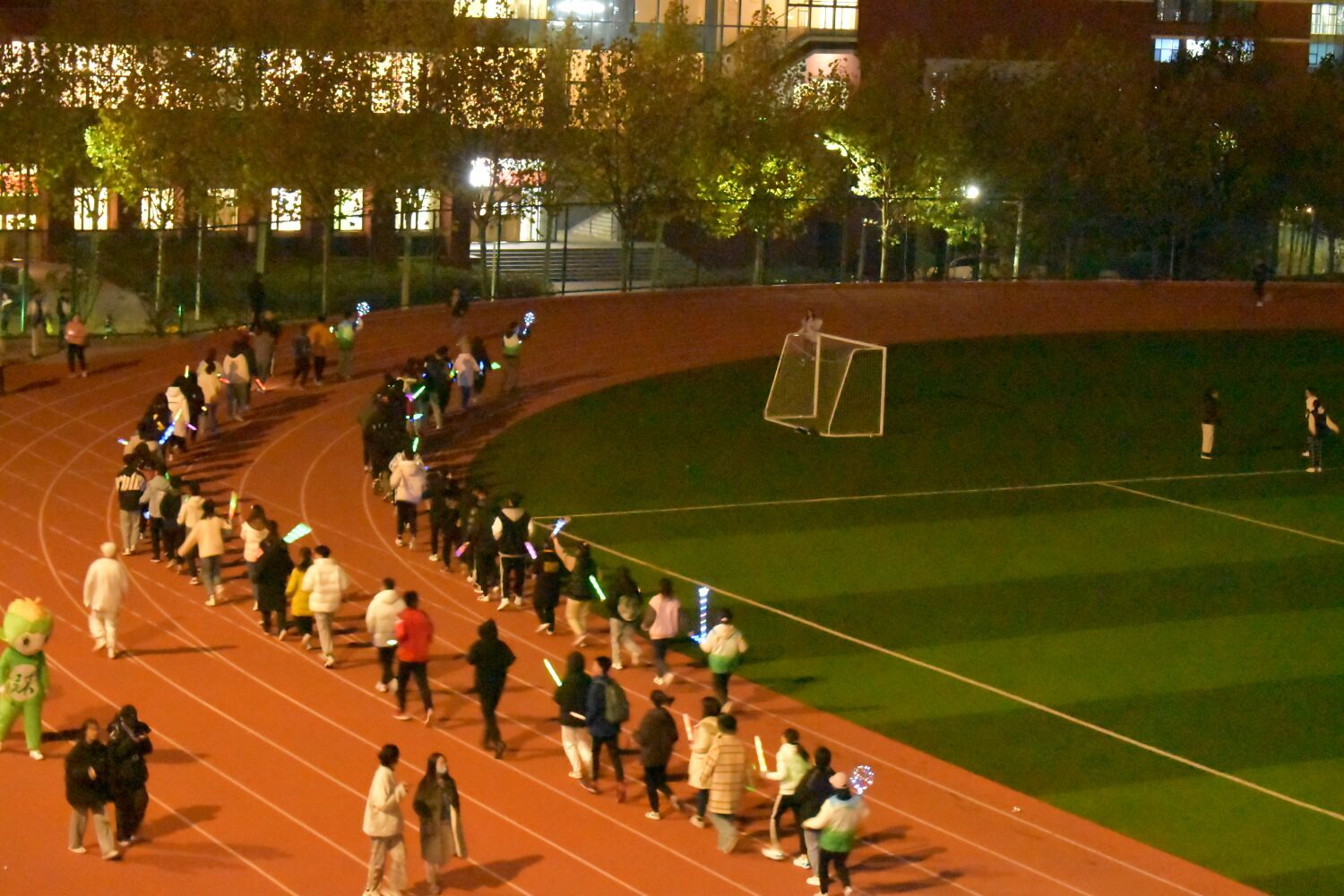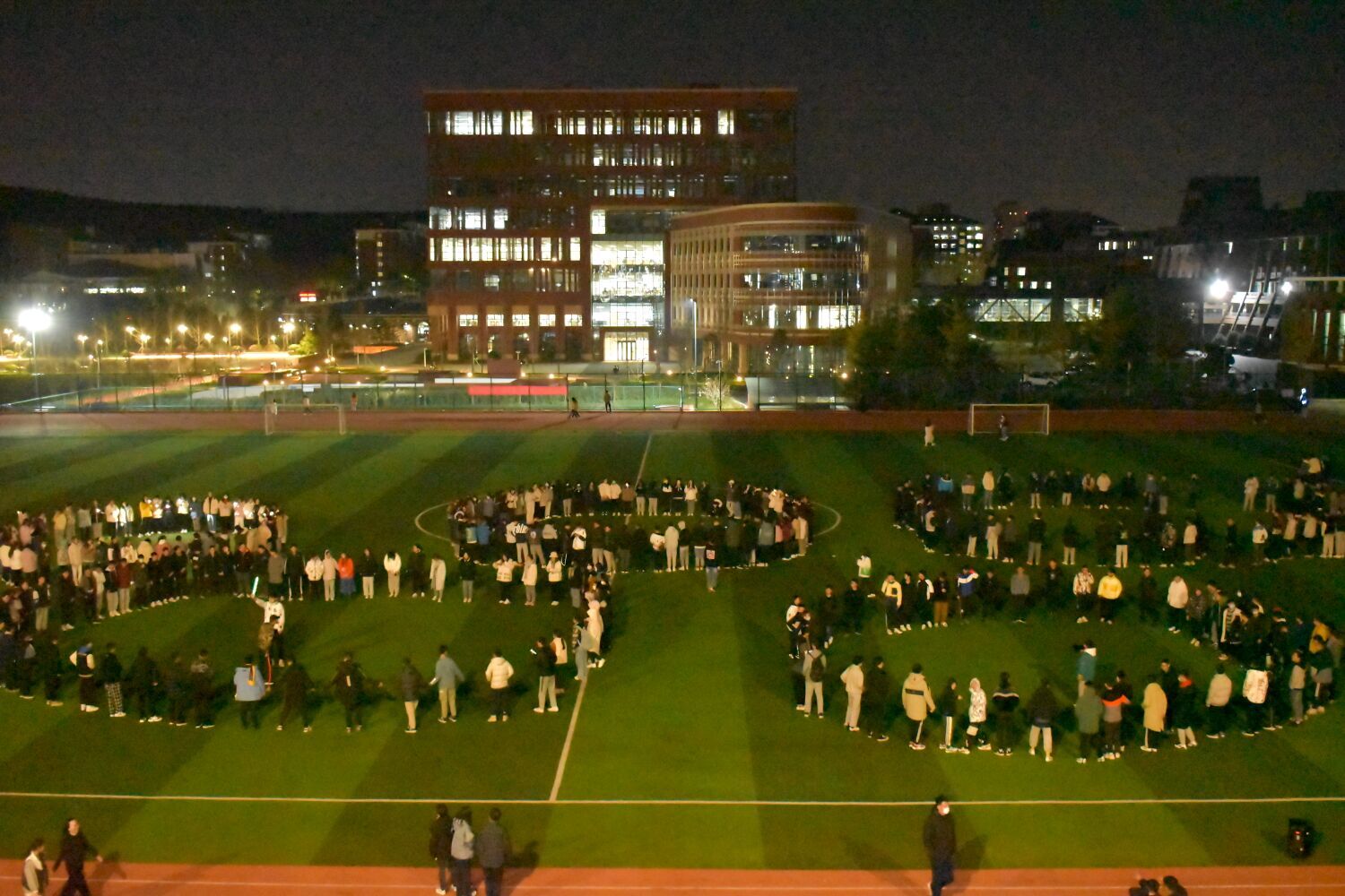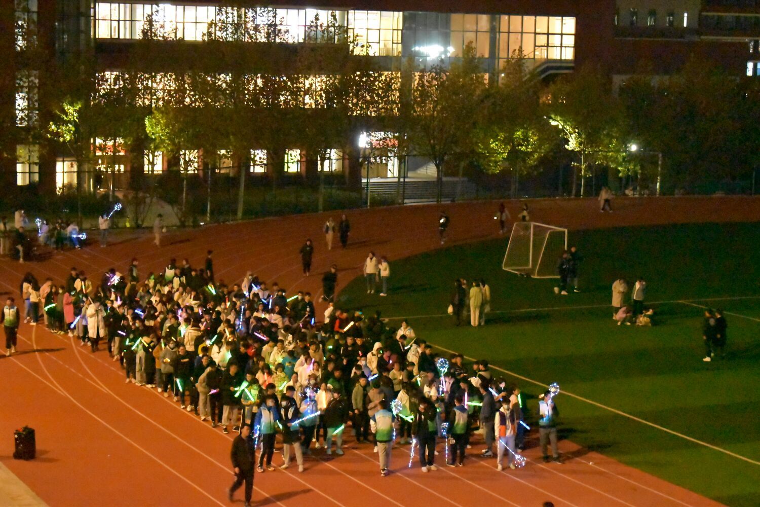 活动当天,随着夜幕降临,各学院的参与者纷至沓来。在工作人员的引导下,各位夜跑者在跑道上整齐地排好夜跑队形,为迎冬奥——航拍奥运五环做好准备。晚八时许,一盏盏照明灯关闭,一束束荧光棒亮起,全场的气氛逐渐变得浓郁,主持人一声令下,各路夜跑方队围绕着由学生组成的“五环”呈环绕之势穿插交错。根据主持人下达的口令,各路夜跑小队原地站定并挥舞起手中的荧光棒,与闪烁的五环交相辉映,全场气氛达到最高潮。迎冬奥五环拍摄结束后,本次活动进入第二阶段,各位夜跑者来回奔赴于各游戏打卡点,集印章,套奖品,操场上欢声笑语不断。
