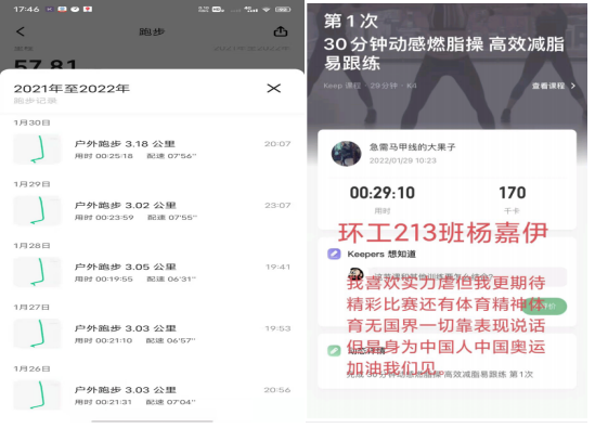 为增强学生们体质,学院举办迎冬奥运动打卡活动。活动期间,同学们不畏冬日的寒风,走出家门,将冰雪运动与青春活力完美融合,开展了形式多样的打卡活动。如滑冰、滑雪、3公里慢跑、10分钟的燃脂操、15分钟的瑜伽、8公里骑行、30分钟跳绳等。活动过程中,参与同学每天提交运动打卡天数、跑步里程累计等个人运动截图,并在图片中为冬奥留言送祝福, “北京冬奥会锣鼓喧,四海汇聚翘首盼”、“奥视群雄,好运相随,奥霜斗雪,幸运相伴”、世界人民齐瞩目,看奥运健儿显身手“……表达对冬奥会的美好祝愿。