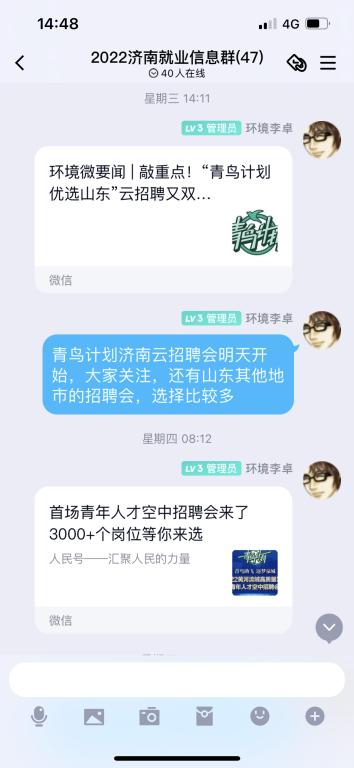 精准推送就业信息 打好就业信息战 借助“青鸟计划”,设立青鸟计划联络员,建立山东省16地市的就业信息发布群,为广大毕业生推送各个地市的工作岗位,实现就业岗位精准推送。同时进行分专业、分地区的归类整理,将招聘信息同步推送到年级就业群内供同学们参考选择,提升覆盖面,为同学们提供了岗位的“信息库”。在发布信息的同时鼓励同学们参加“云招聘”,积极应聘。