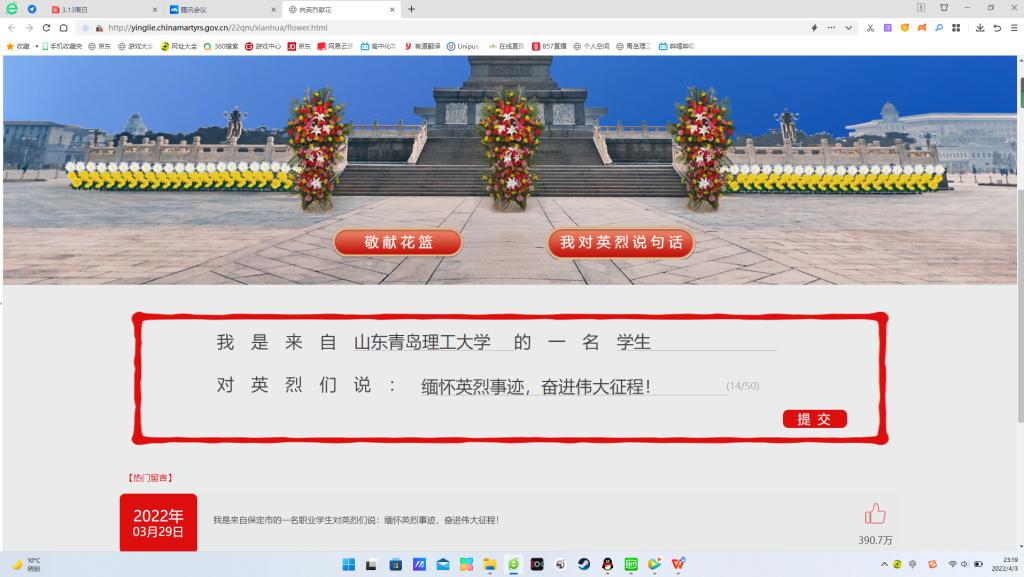 祭英烈 同学们通过“中华英烈网”进行线上祭奠英烈,为英雄敬献花篮,并举办“颂公千秋史,寄君墓志铭”活动,号召同学们以撰写墓志铭的形式对英烈寄托哀思。