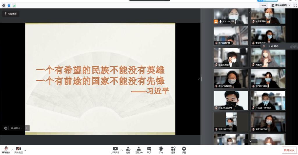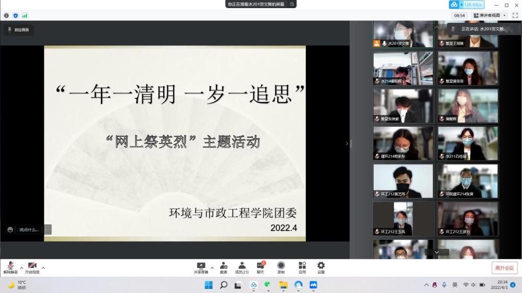 为引导学生树立民族自尊心与自信心,弘扬伟大的中华民族精神,真正把爱国之志变成报国之行,4月3日晚9点,环境与市政工程学院繁星志愿者协会于线上开展“网上祭英烈”主题活动,繁星志愿者协会全体成员正装参会。
