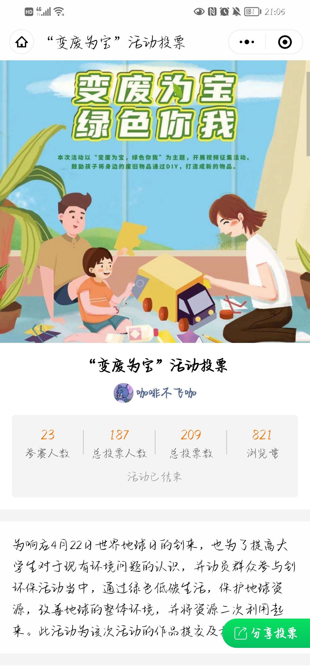 变废为宝,践行环保使命 环保志愿者协会举办“变废为宝”活动,号召同学们利用身边的废品来制作崭新的物品,将资源得到最大化利用。