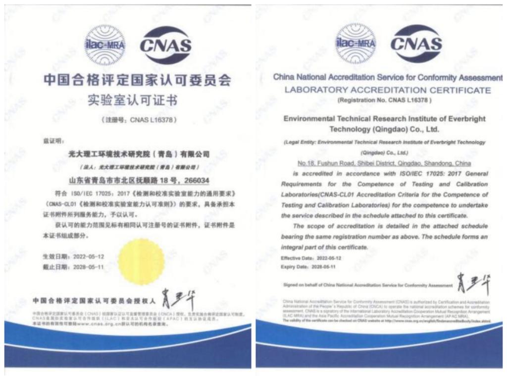 近日,光大青岛理工环境技术研究院(以下简称青岛研究院)正式收到中国合格评定国家认可委员会(简称“CNAS”)颁发的实验室认可证书(证书编号:CNAS L16378),跻身国家认可实验室行列,标志青岛研究院具备了“中国认可、国际互认”的二噁英检测能力。