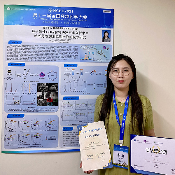 李爽同学的研究成果“基于磁性COFs材料快速富集分析水中新兴芳香类消毒副产物的技术研究”,以墙报的形式进行了汇报展示,展现了我校研究生的风采,期间与对该研究成果感兴趣的各位学者进行了学术交流。李爽同学此次汇报的研究成果荣获第十一届全国环境化学大会研究生论坛优秀展报奖、曼迪匹艾科技服务有限公司冠名研究生墙报奖。