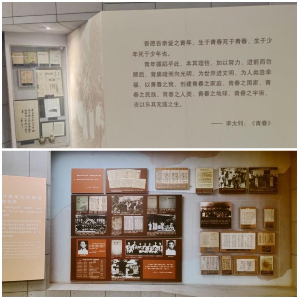 穿过瞻仰厅,走进第一展厅,实践团成员们便走进了李大钊的成长之旅。从1840年鸦片战争开始,随着西方列强用炮火打开中国的大门,中国的主权和领土完整遭到破坏,沦为半殖民地半封建社会,国家危亡,社会黑暗,民不聊生。李大钊就出生在这个民族灾难深重的年代。李大钊年少便双亲离世,他在祖父李如珍的悉心抚育、严谨庭训下勤奋学习。1907年李大钊选择考取天津北洋法政学校,毕业后李大钊为进一步寻求救国救民的真理,于1913年在友人资助下东渡日本求学之后回国,1917年,李大钊进入北京大学任职。自此,李大钊踏上了传播新文化新思想的革命征程。随着陈独秀把《新青年》编辑部从上海迁到北京,《新青年》也由陈独秀个人主办改为同李大钊、鲁迅、胡适等共同编辑。这样就形成了一个以《新青年》为中心的新文化运动的阵营。他们高举起反帝反封建的大旗,掀起了一场轰轰烈烈、波澜壮阔的新文化运动大潮。实践团站在李大钊先生的故土上回望历史长河,川流不息的人群与精心保存的展品映入眼帘,李大钊先生曾经播撒下的红色火种如今已在这片土地上迸发出无穷的力量,青年人正踏着先辈蹚出的光明之路坚定前行。