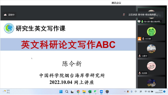 2022年10月4日,中国科学院烟台海岸带研究所研究员、博士生导师、国家有突出贡献中青年专家、泰山学者陈令新研究员应邀为环境与市政工程学院广大师生作了题为“英文论文写作ABC”的专题报告。会议采用线上方式,环境与市政工程学院共150多位师生听取了报告,会议由副院长马继平主持。