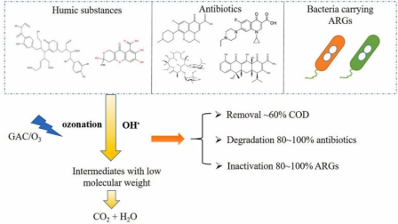 生活垃圾填埋场渗滤液浓缩液富含难降解污染物、抗生素、抗性基因(ARGs)等多种污染物,处理不当会产生潜在的生态环境风险。因此,同时且高效地去除浓缩液中多种污染物十分有必要。基于活性炭催化臭氧技术(GAC/O3)在有机污染物降解方面的优势,研究团队采用GAC/O3技术降解浓缩液中难降解污染物、抗生素和ARGs等多种污染物。研究结果表明,当GAC为4 g/L、O3浓度为80 mg/min、初始pH 7.65时,COD和UV254去除率分别为55.7%和77.3%,同时可同步降解84~100%的抗生素以及84~100% ARGs。可见,GAC/O3技术可同时去除浓缩液中难降解有机物、抗生素及抗性基因等多种污染物。相关研究成果已被环境科学领域Top期刊 Journal of Cleaner Production接收发表(DOI: 10.1016/j.jclepro.2022.135016)。