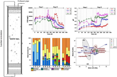 生活垃圾填埋过程中添加飞灰(BA)可以在一定程度上提升填埋场生物稳定性及渗滤液理化性质。然而,不同的BA添加比例会导致填埋场中微生物结构和丰度均显著变化,进而使得与微生物作用紧密相关的渗滤液产生、性质及其相关机制发生改变。针对这一问题,研究团队构建生活垃圾填埋场生物反应器,并通过将生活垃圾与不同比例BA混合(0%、5%、10%和20%)探究填埋反应过程中微生物群落结构演替规律以及渗滤液的理化性质的响应变化情况。研究结果显示:随着BA添加量的增加,微生物多样性增加、群落结构变化,但是其代谢途径受到抑制;与之相对应,渗滤液pH迅速达到中性,ORP、COD、VFA、NH4+-N、Ca2+和SO42-降低,腐殖化速度提升。相关研究成果环境科学领域Top期刊 Bioresource Technology接收发表(DOI: 10.1016/j.biortech.2022.127720)。