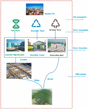 立足我国双碳战略和“无废城市”建设,研究团队以青岛市为例,采用生命周期评价法(LCA)和物质流生命周期清单研究了城市生活垃圾在不同处理处置模式下(包含生活垃圾分类)的碳排放情况。研究结果显示:传统的生活垃圾混合收集+填埋的处置模式,碳排放量最高(568.98 kgCO2-eq/t);生活垃圾分类收集+厨余垃圾厌氧发酵+其他垃圾焚烧模式下,碳排放量分别减少至4.27 kgCO2−eq/t;垃圾完全分类(厨余垃圾厌氧发酵、可回收物再利用和其他垃圾焚烧)模式下,碳排放量为−269.34 kgCO2−eq/t,可实现碳中和。因此,提升生活垃圾中可回收物的资源化再利用率是实现GHG减排行之有效的方法。相关研究成果已被环境科学领域Top期刊 Journal of Cleaner Production接收发表(DOI: 10.1016/j.jclepro.2022.134275)。