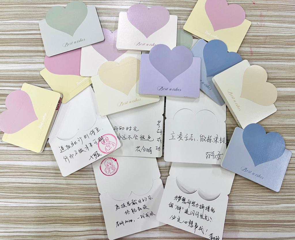 是笔墨书写的祝福,是亲手传递的真情。一张张心形卡片,寄托着班主任、辅导员对每一位考研学子的殷切期盼与真诚祝福。如同冬日里跃动的火苗,温暖着考研学子的心。