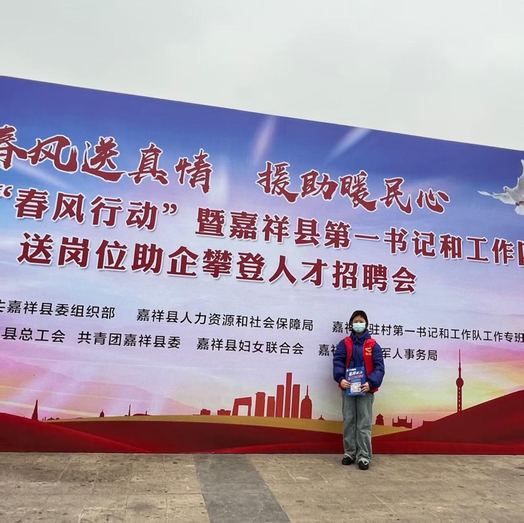 为进一步调查嘉祥县人才流失情况,2月7日,李媛媛参加了“2023年‘春风行动’人才招聘会”志愿服务。经过一个小时的培训,李媛媛便开始向求职者简单介绍工作岗位以及薪资状况,并带他们来到相应的候职区。通过与应聘者交流,对他们的求职心理以及生活状况有了更进一步的了解。