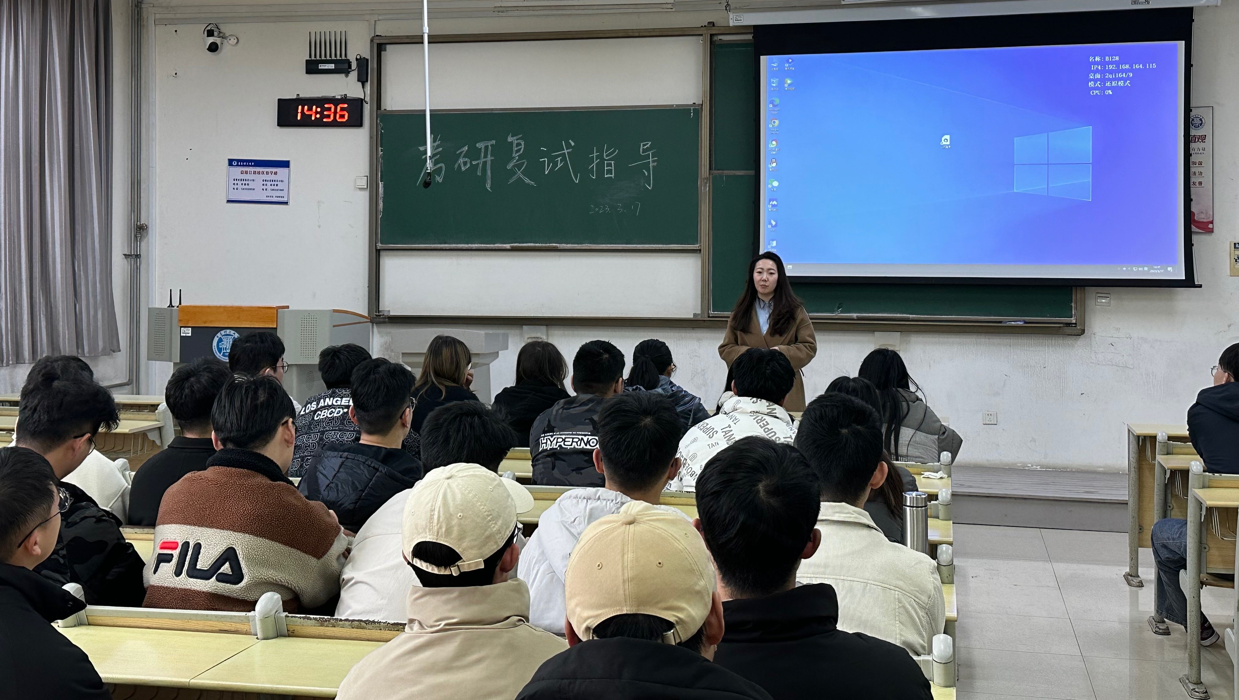 最后,学院研究生教学秘书任珂老师为同学们介绍了学院2023年考研招生情况,从各专业的招生数量,是否有调剂名额,调剂系统何时开放以及专业课不同能否调剂等方面一一为同学们进行答疑。