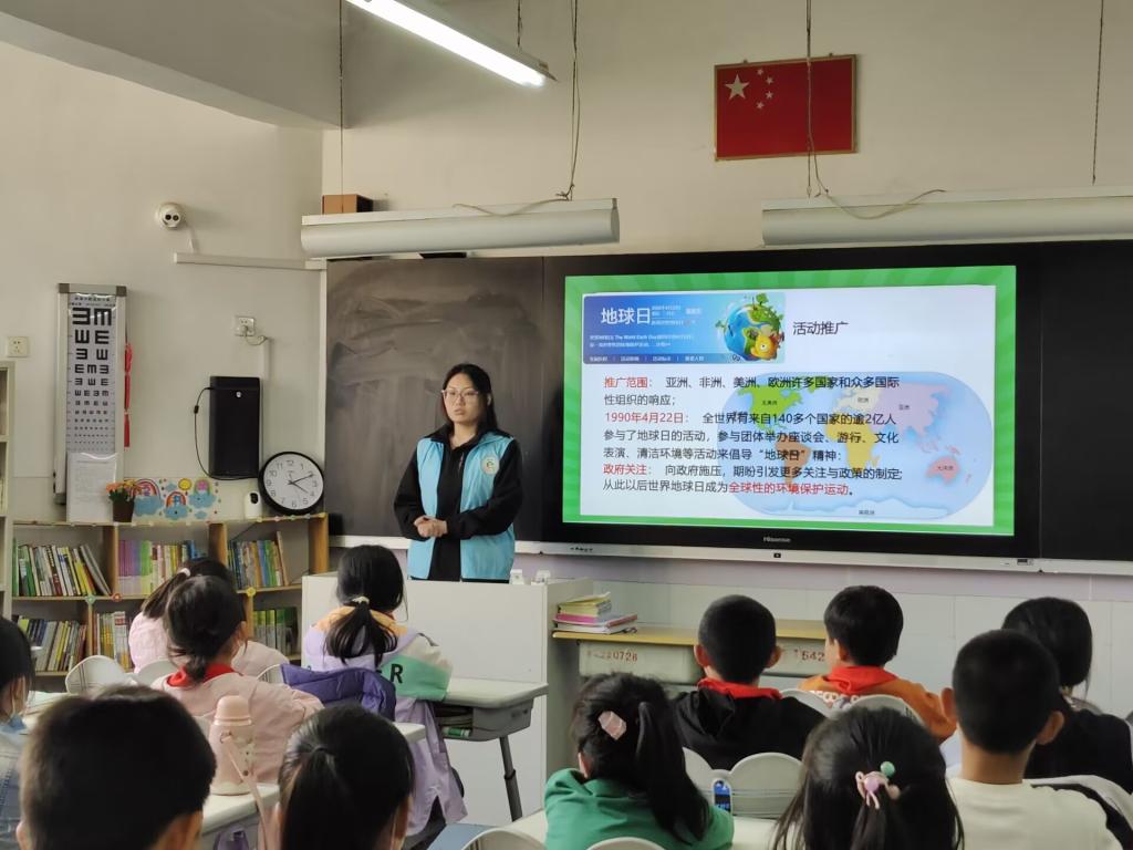志愿者们由身边绿植领养、垃圾分类、净滩行动、植树造林等活动为起点,以小见大,细致地向同学们讲解了世界地球日的活动起源、活动历程、相关知识等,除此之外还探讨了在生活中应该如何保护环境,小朋友们畅所欲言,提出了随手关灯、不踩踏草坪、垃圾分类、低碳出行、杜绝浪费、节约粮食等与生活息息相关的保护环境的有效措施。