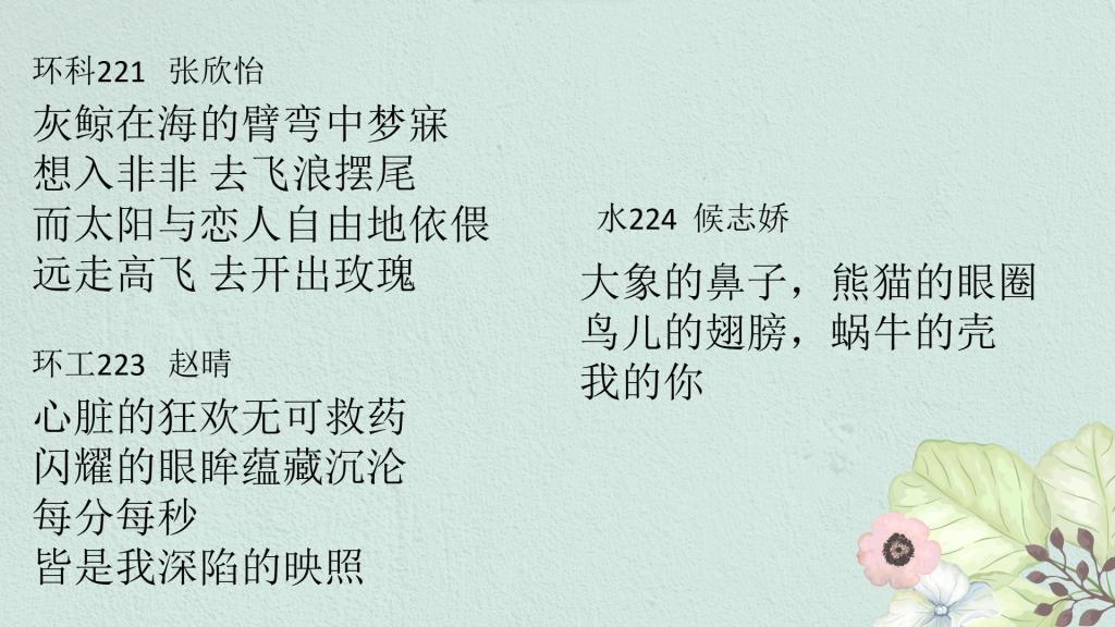 为培养同学们的健康心理品质,增强心理调适能力,帮助同学们抒发情感、摆正心态,以昂扬的斗志、健康的心态面对生活中的困境。环境与市政工程学院绿蕊心理协会于4月24日举办“三行情书——说出你的爱”作品征集活动及线上投票活动,并于5月10日完成作品颁奖。本次活动旨在用文字抒发心声,以诗词传递能量,激励同学们勇敢地表达内心想法。
