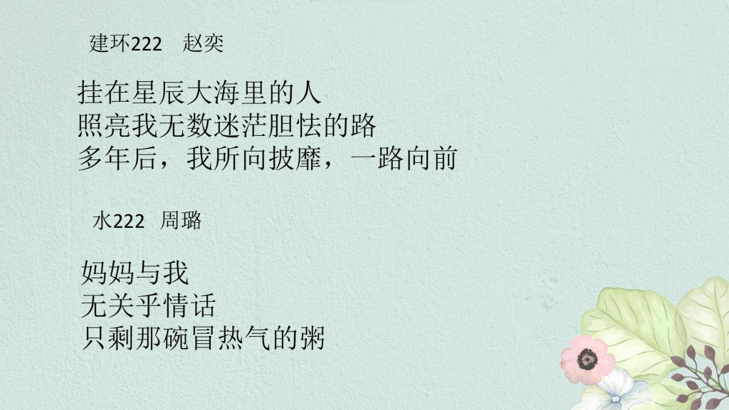 见字如面,纸短情长,简短的三行情诗,是内心爱的抒发。本次活动形式新颖,贴近日常生活,对于学生的健康成长具有重要的意义。通过活动开展,不仅可以培养学生对于父母的感恩意识,也能引导学生树立正确的恋爱观;同时,这种简单而又情感温度的活动也可以加强学生彼此之间的情感联系,增进学院的凝聚力。(撰稿:贾婉琦;审核:隋学智)