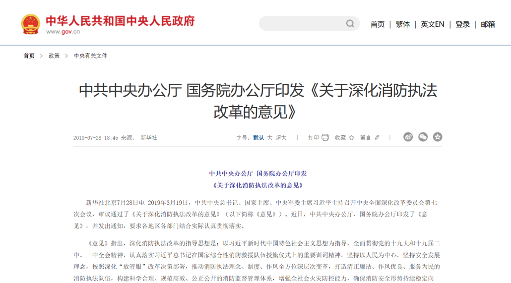 图1 国务院发布《关于深化消防执法改革的意见》