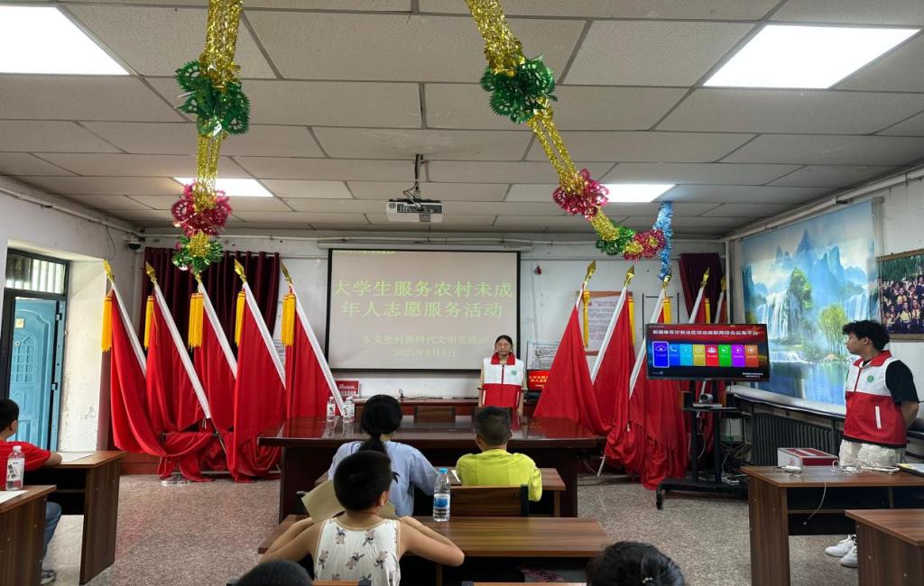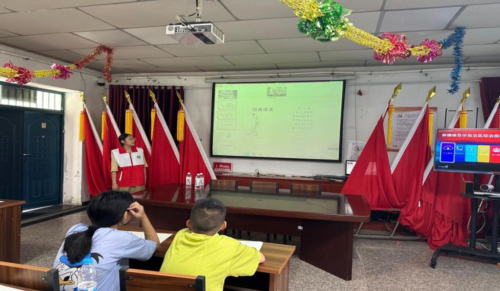 团队成员胡羽婷、袁蕊、蒋家和来到乌鲁木齐市安宁渠东戈壁村村民委员会,为未成年儿童讲解传统神话故事-瑶池西王母。