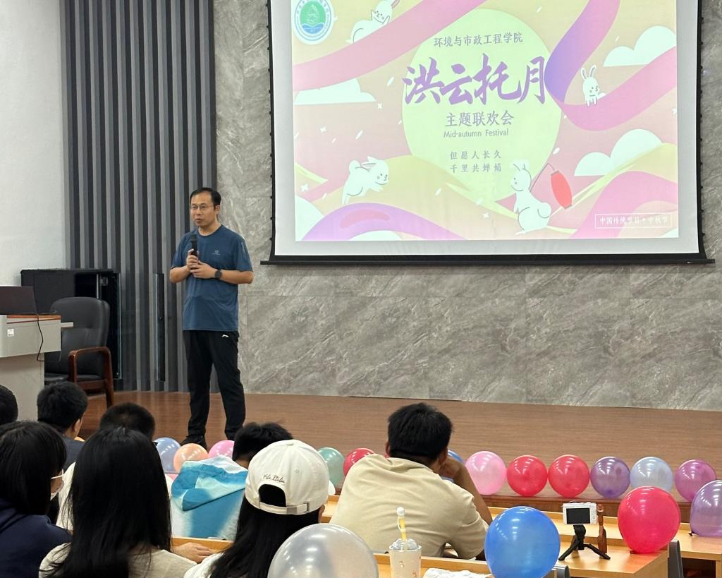 中秋佳节,丹桂飘香。为弘扬中华民族传统文化,增强在校学生的归属感,提升中秋佳节的氛围感,加强对学生的人文关怀,9月29日下午,环境与市政工程学院举办“洪云托月”中秋主题联欢会。学院党委副书记、副院长隋学智、副院长刘龙,2023级新生辅导员何珊珊、罗荣一同与同学们共度佳节。