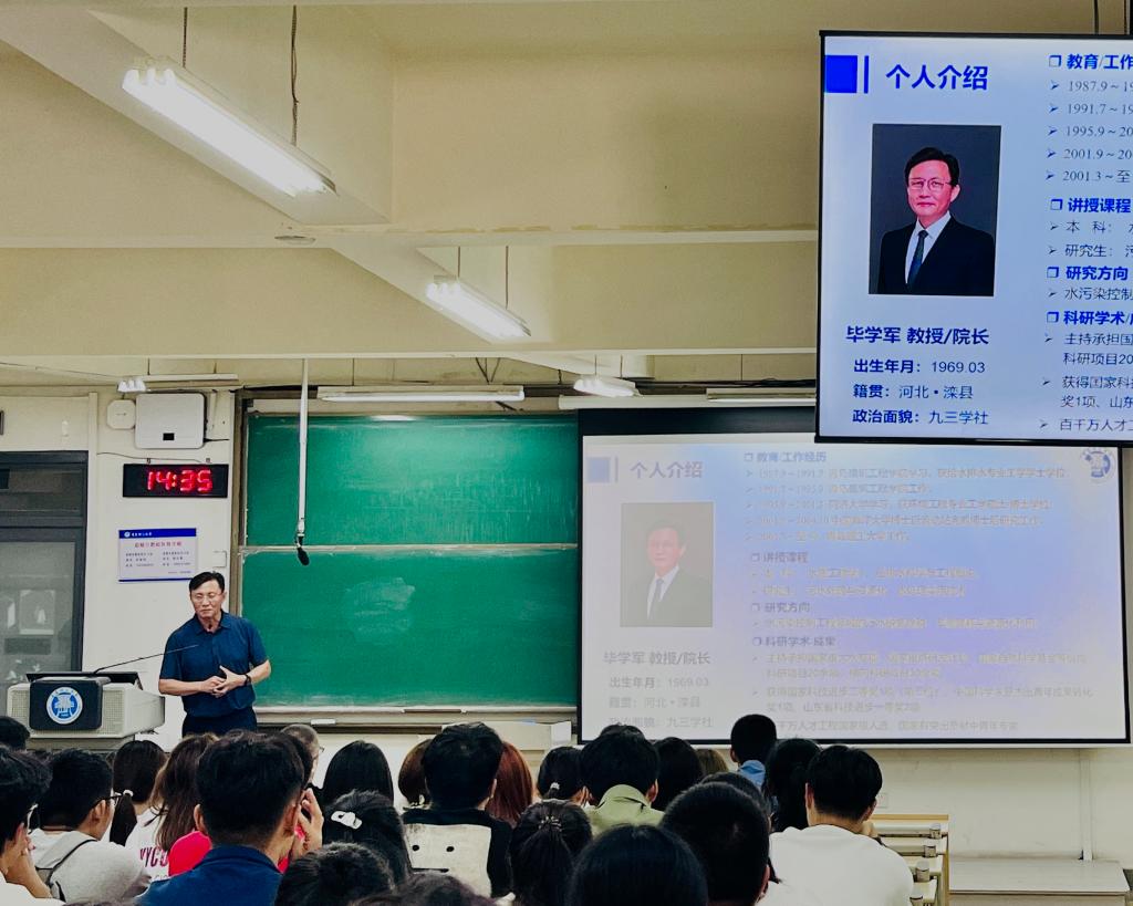 在给排水科学与工程专业教育的现场,环境与市政工程学院院长毕学军代表参会教师对2023级新生的到来表示热烈欢迎。随后,从院徽释义、历史沿革、师资力量、发展定位与办学成果等方面讲解了校史院情,让学生深刻理解“明德、博学、笃行、励新”的院训。增强了新生代学子对学院的认同感、归属感和荣誉感,激发了学子的爱校荣校热情。