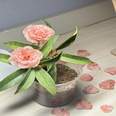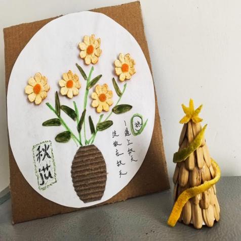 在“粮食”制作比赛中,同学们用橘子皮、柚子皮、坚果壳等制作手工作品。大家热情高涨,发散思维,创造出了丰富多彩的作品,展现了同学们优秀的创造力。