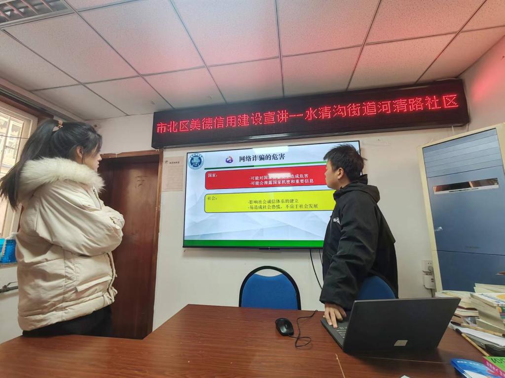 网络安全为人民,网络安全靠人民。为提高群众网络安全防范意识,2024年12月1日,由环境与市政工程学院建筑环境与能源应用工程专业五名本科生组成的宣讲小队,前往青岛市市北区水清沟社区开展“众网成络,安全为脉”主题宣讲活动,旨在为中老年群体普及网络安全知识,帮助社区居民预防网络安全问题。