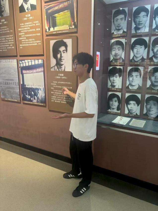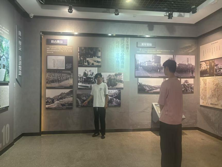 在讲解环节,队员以馆内珍贵的历史照片、革命文物和文献资料为生动教材,娓娓道来青岛大地上的革命峥嵘岁月。从五四呐喊到抗日烽火,从解放壮歌到建设征程,团队成员用真挚的情感讲述先烈为民族解放和国家独立抛头颅、洒热血的感人事迹,引导观众沉浸式感受革命先辈坚定的理想信念与无私奉献精神。队长叶子臻动情地说:“每一件革命遗物背后,都是一段热血写就的历史。今天的安稳,源于先烈曾经的坚守。我们青年更应铭记历史、传承精神、勇担使命。”