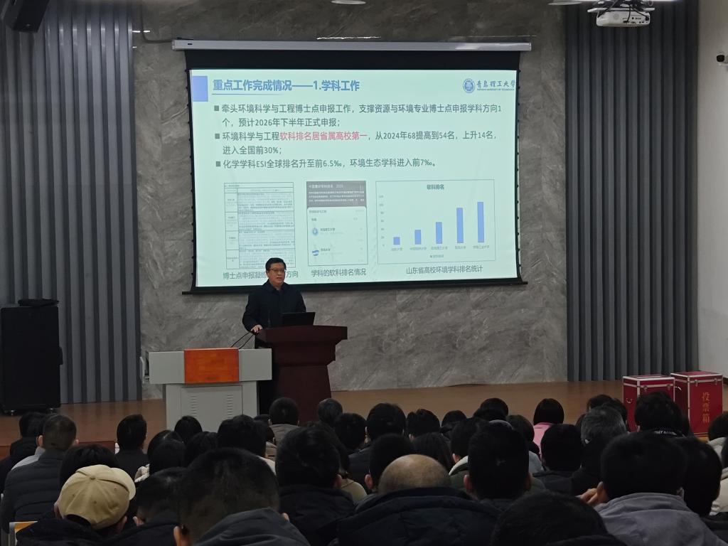 近日,环境与市政工程学院2025年度工作总结暨2026年度工作部署大会在学院学术报告厅G101隆重召开。学院党政领导班子全体成员、学院全体教师出席会议。大会以全面回顾2025年工作成效与实践经验、科学研判发展新形势、系统部署2026年目标任务为核心,凝聚全院师生共识与力量,为学院事业高质量发展锚定方向。