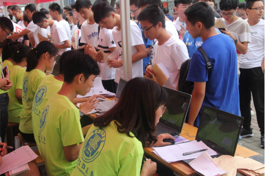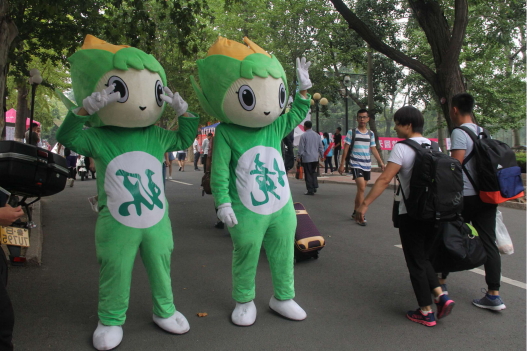 我们的志愿者在工作中都坚守自己的岗位,引领新生报到、分发入学材料,志愿者们工作认真细致,耐心地为新生和家长答疑解惑,获得了家长和学生的一致感谢和好评。特别让人感动的是,有毕业生和上一届学生会主席团主动来到现场,协助大家完成迎新工作,还有几位大四学长前往车站迎接帮助困难新生,带去了满满的关怀与温暖。“环环”、“境境”两位吉祥物更是不畏炎热,穿戴厚重的服饰出现在迎新现场,吸引了不少新生以及新生家人合影留念。