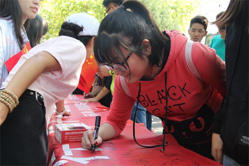 学生们在横幅上签上自己的名字,同时获得学生会分发的纪念小国旗。整场活动热情洋溢,同学们纷纷认真地将自己的名字签写在横幅上,用实际行动响应号召,通过这种形式表达对祖国母亲的热爱之情与对党的十九大即将召开的期盼之情。签名活动结束后,横幅将悬挂于北院篮球场处,影响和感染更多的人。