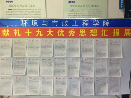 党的十九大是在全面建成小康社会决胜阶段,中国特色社会主义发展关键时期召开的一次十分重要的大会,每一位党员和入党积极分子都应当认真学习和理解党的十九大的重要精神。环境学院学生党支部的各位党员和入党积极分子把自身对十九大精神的学习体会,结合最近的党课、优秀校友交流会和好文分享等活动,积极向组织递交了思想汇报。环境学院党总支经过认真挑选,选出二十余份优秀思想汇报并在学院醒目位置进行展出,提供给全学院的老师和同学参观学习。