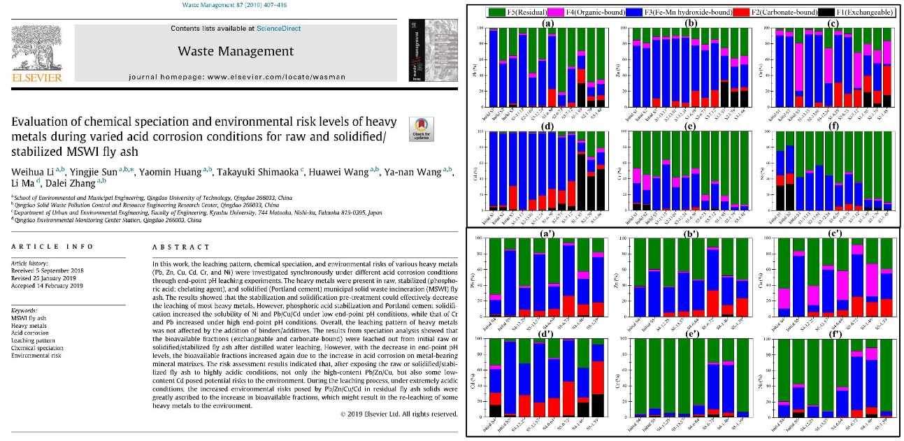 近日,我校环境与市政工程学院博士研究生李卫华在固体废物处理领域国际权威期刊《Waste Management》上发表最新科研成果“Evaluation of chemical speciation and environmental risk levels of heavy metals during varied acid corrosion conditions for raw and solidified/stabilized MSWI fly ash”(DOI:10.1016/j.wasman.2019.02.033)。论文通过模拟实验评估了固化/稳定化飞灰在酸性侵蚀条件下重金属浸出的环境风险问题。研究发现,飞灰中重金属不仅会因酸性侵蚀进入环境,且部分重金属的化学形态会因酸性侵蚀向易浸出形态转化,进而增加其进入环境的风险。该研究结果对我国飞灰处置管理具有重要的指导意义。这是李卫华同学以第一作者发表的第四篇JCR一区论文。《Waste Management》(ISSN: 0956-053X)是固体废物领域权威期刊,具有较高国际影响力,2018年影响因子为4.723。