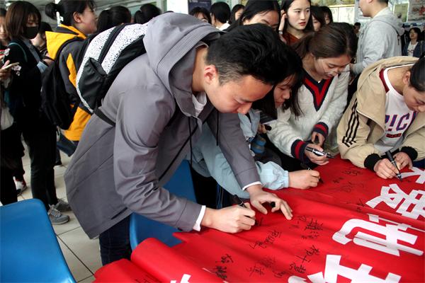 学院年轻教师带头在横幅上签名,学生们纷纷响应,积极参与。在横幅上签下自己的名字,表示对于光盘行动的支持,作出了自己的承诺。