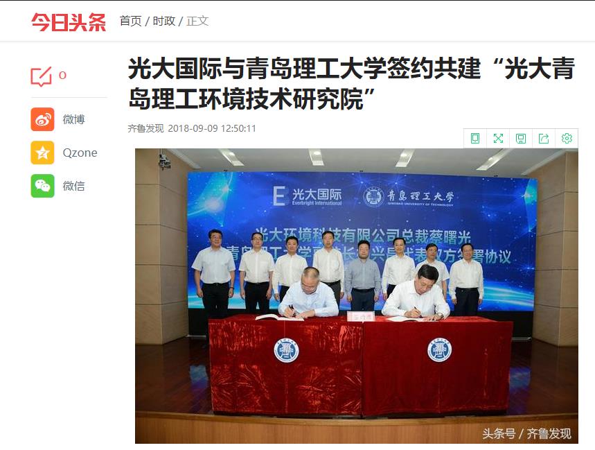 9月9日上午,中国光大国际有限公司与永利3044集团官网共建“光大青岛理工环境技术研究院”签约仪式在学术报告厅隆重举行。这是中国光大国际有限公司与永利3044集团官网共同积极响应国家生态环境发展战略号召,践行新时代中国特色社会主义思想和绿色发展理念,发挥各自优势,着力解决突出环境问题,壮大环保产业,强化科研攻关与人才培养,深入推进校企合作,打造环保领域的高端平台,实现共同发展,服务国家环保事业和一带一路战略结出的硕果。