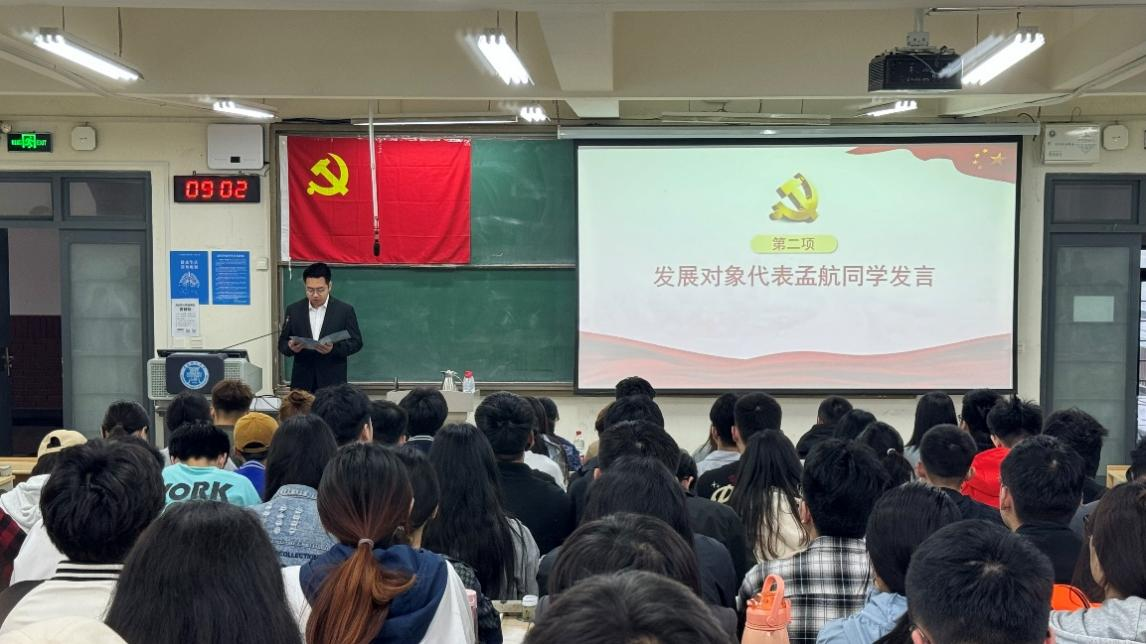 在雄壮的国歌声中,开班仪式庄严地拉开序幕。随后,本期发展对象代表孟航同学结合自己的成长经历,立足实际,作了精彩发言。他说道,“作为一名发展对象,我们应自觉以党员标准严格要求自己,肩负起青年的责任使命。”