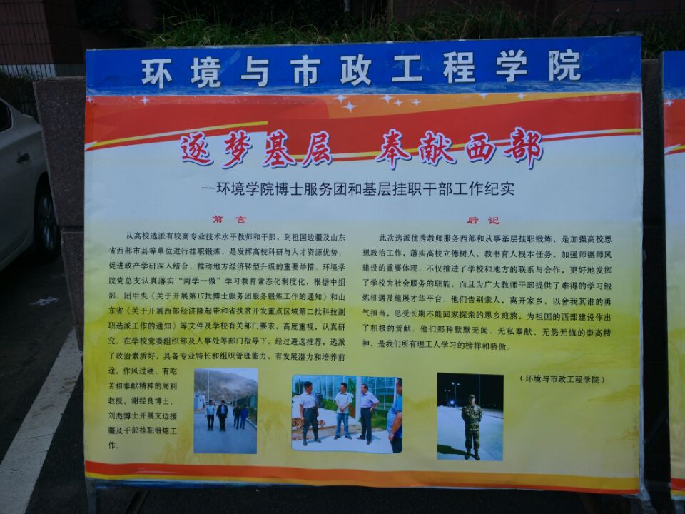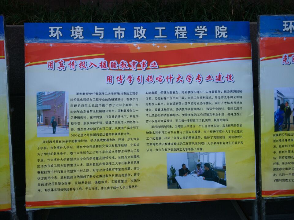 2016年底,根据中组部、团中央《关于开展第17批博士服务团服务锻炼工作的通知》和山东省《关于开展西部经济隆起带和省扶贫开发重点区域第二批科技副职选派工作的通知》等文件及学校有关部门要求,在学校党委组织部及人事处等部门指导下,经过遴选推荐,选派了周利教授赴新疆喀什大学支教,谢经良博士赴青海玉树州、刘杰博士赴德州宁津县挂职。三位博士支教挂职半年以来,克服语言不通、高原反应、强烈紫外线、生活条件相对艰苦等困难,很快适应新环境,融入当地工作生活之中,利用自身专业特长,为当地教育、环保、经济发展等做出了突出成绩,他们扎实渊博的学识及谦虚踏实的作风,受到了挂职单位领导的好评。学院举办的这次展示活动,既有网络媒体宣传,也有现场展板展示。分别展示了三位博士在喀什大学、青海玉树州以及德州宁津挂职半年以来为挂职单位做出的突出业绩。