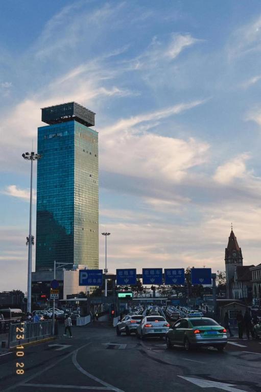 高耸入云的建筑与青岛高铁站古雅的建筑相对着,这一刻仿佛看到了时代的轮回,他们之间,是一列列井然有序的车行去迎接对这座城市充满好奇的客人或是欢送对青岛恋恋不舍的故人,步履匆匆的行人慌忙地追赶着日暮,这一刻,相机记录下了他们的脚步。伟岸的建筑明暗交错,一面是古建筑的影子,是过去的留存;一面是日光的照耀,是新生的光芒。蔚蓝的天空与白云交织,照片里,他们仿佛成为了城市的背景,衬托着青岛暮色里的容光。