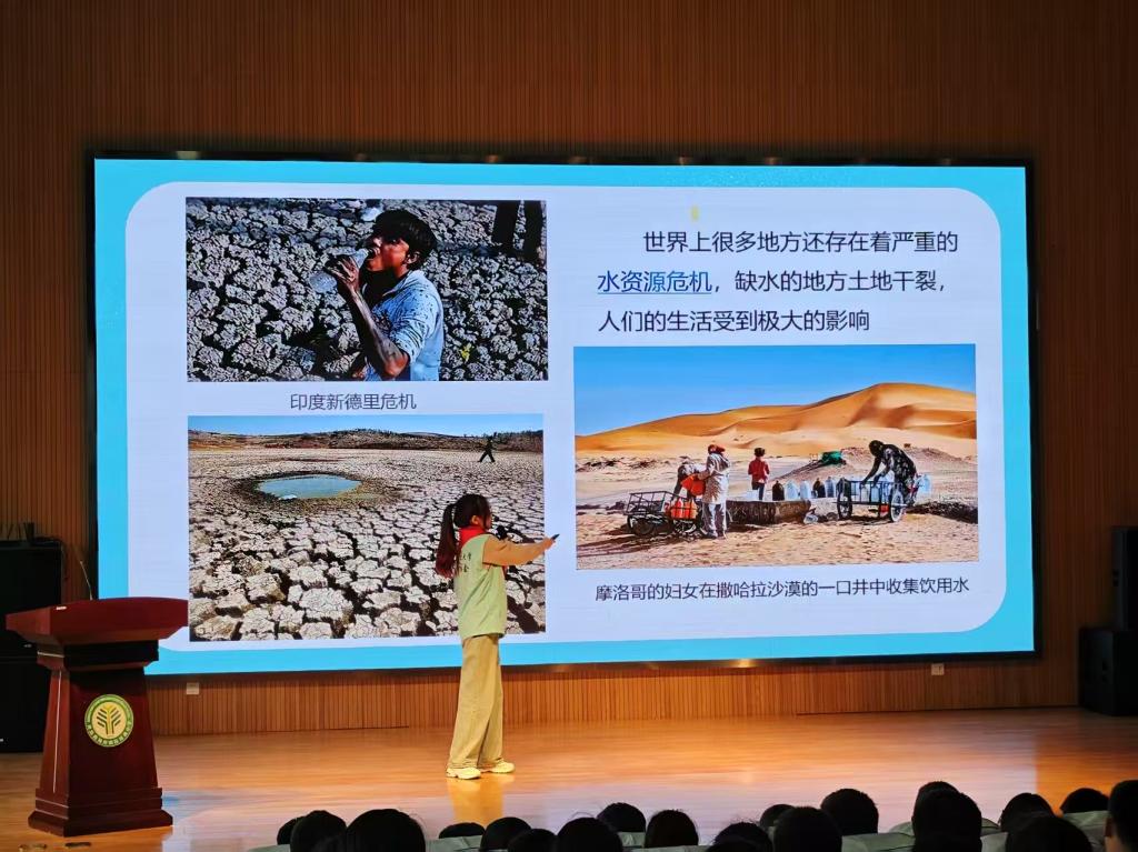 在报告厅中,志愿者用通俗易懂的语言和生动的案例,向孩子们讲解了生态环保的重要性以及如何在日常生活中践行环保理念。从“绿水青山就是金山银山”切入,到植树节、森林保护,再到世界水日、水资源现状和海洋面临的严峻挑战,都被一一呈现。问答环节孩子们热情高涨,积极抢答,从“森林的重要作用”到“日常生活中的节水方法”,他们的回答充满童真又饱含对环保的独特见解。一位参与活动的孩子感慨道:“这次活动让我对环保有了全新的认识。以前我虽然知道环保重要,但没有深刻意识到身边这些小事对环境的影响这么大。以后我不仅自己会做好植绿护水,还会带动身边的人一起参与。”