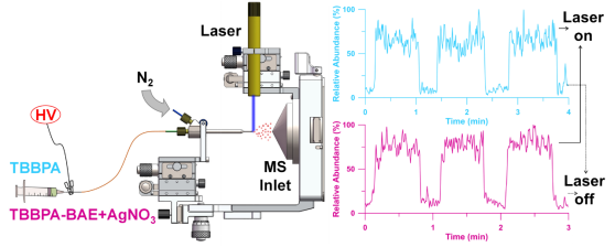 研究团队成功开发激光辅助电喷雾电离质谱(laser-assisted ESI-MS)装置。利用简易的激光探头(450 nm、500 mW)聚焦于电喷雾喷嘴尖端,实现了激光与电喷雾高电压协同作用电离,显著提升了TBBPA与TBBPA-BAE的电离效率(图1)。研究结果表明,利用开发的laser-assisted ESI-MS分析TBBPA和TBBPA-BAE的灵敏度可较已报道的电喷雾电离和反应电喷雾萃取电离技术分别增强6.1和5.0倍,检出限分别达到3.3和14 ng/L。通过电离源内诱导解离行为分析,结果证实开发的laser-assisted ESI装置平均内能沉积(154 kJ/mol)与常规ESI(148 kJ/mol)无显著差异,表明laser-assisted ESI属于软电离技术,可用于热敏性物质分析。研究团队开发的laser-assisted ESI-MS装置简单,制作成本较低,可显著提高常规电喷雾电离质谱分析灵敏度,实现环境水样中痕量TBBPA和TBBPA-BAE的灵敏分析,具备较好应用前景。