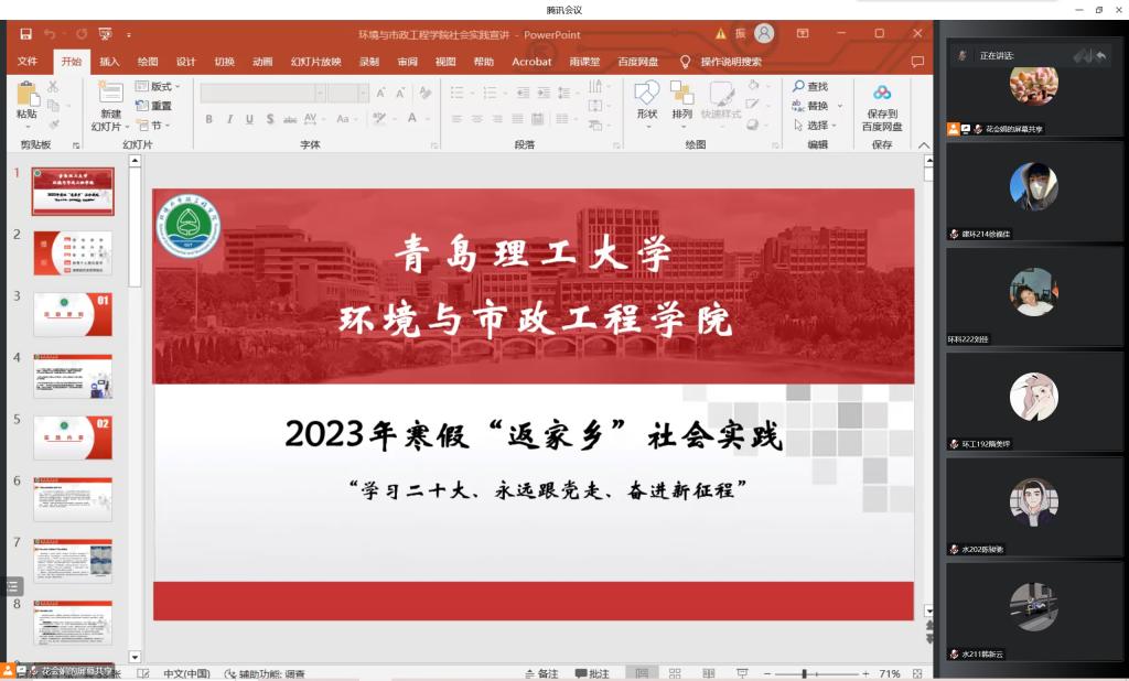 为学习贯彻党的二十大精神,提升学生社会实践能力,推动大学生实践教育向纵深发展。1月11日,环境与市政工程学院召开寒假社会实践动员大会,会议学院学生工作办公室主任、团委书记花会娟,各年级辅导员、团学干部等300余人参会,会议通过腾讯会议线上举行。