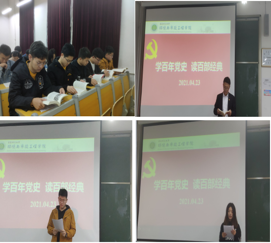 2021年4月23日是第26个世界读书日,环境与市政工程学院学生党支部结合党史学习教育活动开展“学百年党史 读百部经典”主题党日活动。学院党总支书记马莉、副书记邵长飞、辅导员岳磊、王登榜以及全体学生党员参与会议,党支部书记花会娟主持会议。