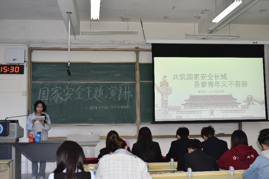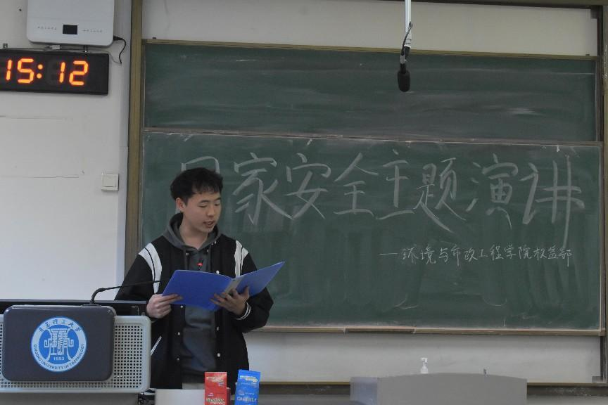 给排水233班的汤曹辰同学由巴以冲突引出了国家安全的概念,对比近代的中国,深刻的指出了国家安全对我们的重要性;环工234班的张新月则以国家安全的五个内涵分层次指出国家安全的多样性,让人耳目一新;来自水231班的陈丽翰同学从国家安全的重要性角度出发,深刻论证了国家安全与每一个公民息息相关,犀利地指出当前我国面临的诸多挑战并提出了一系列针对性的建议。