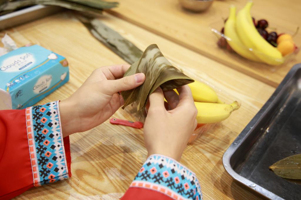 活动开始前,学院已经提前准备好糯米、粽叶、蜜枣、绳线等材料。活动中,老师们与少数民族学生们欢聚祥园餐厅,一起动手包粽子、绘彩蛋,包粽子过程中传来阵阵欢声笑语,热闹非凡。给排水224班杨子华同学是侗族学生,他说:“这是我第一次包粽子,感觉很新奇,包粽子看着容易,但也不是很好学习,很开心有这次体验,等暑假回家后我要给我的家人做一次粽子。”辅导员王玉雪说:“很多同学都是第一次动手包粽子,虽然同学们包的粽子奇形怪状,但是能感受到他们的快乐!”